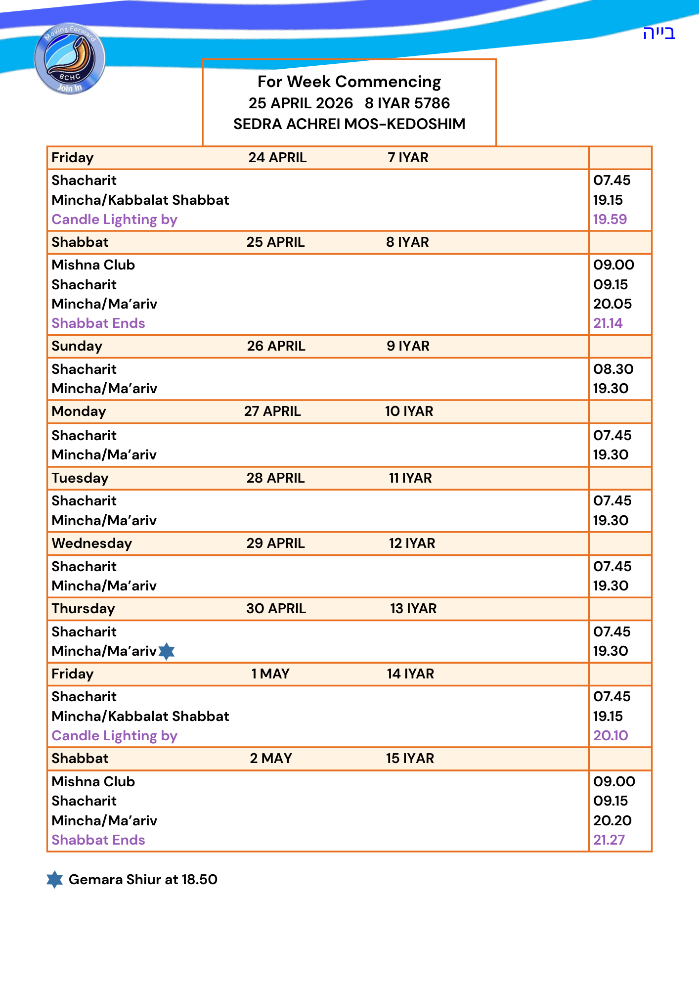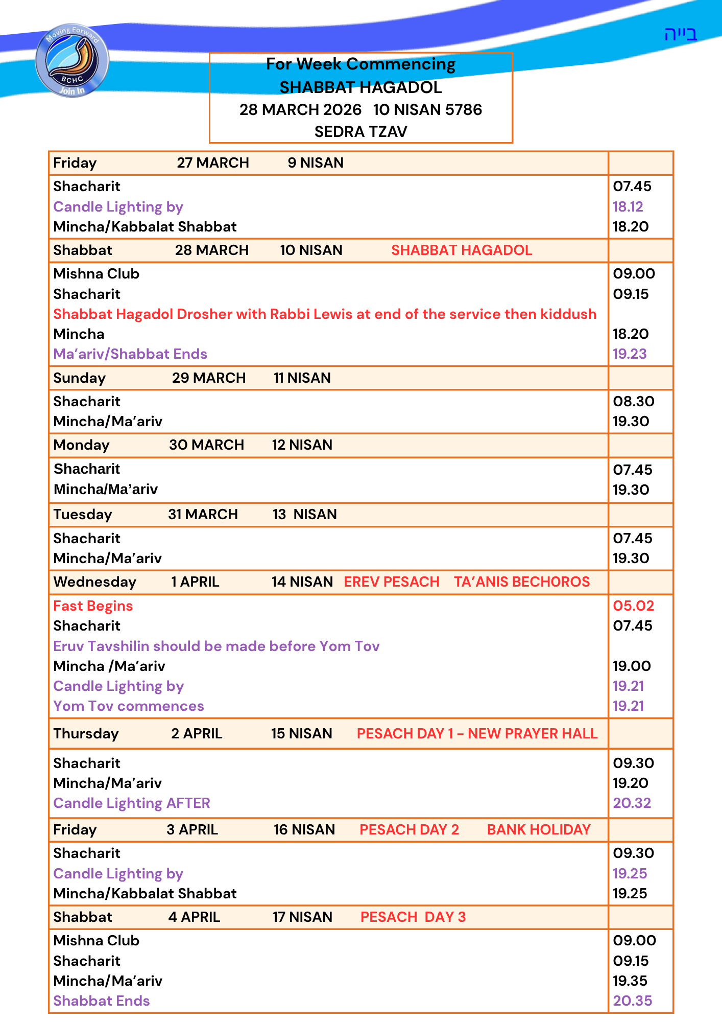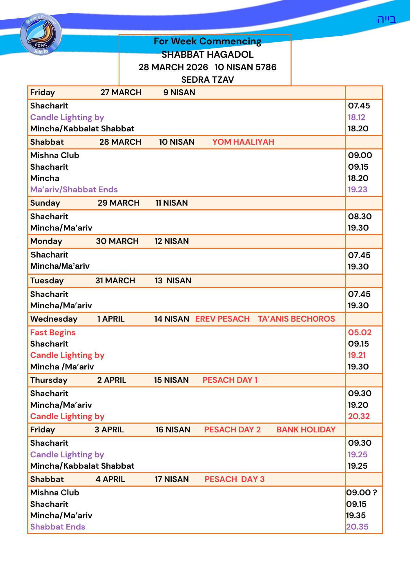 PLEASE SEE THE TIMES OF SERVICES TABLE BELOW.